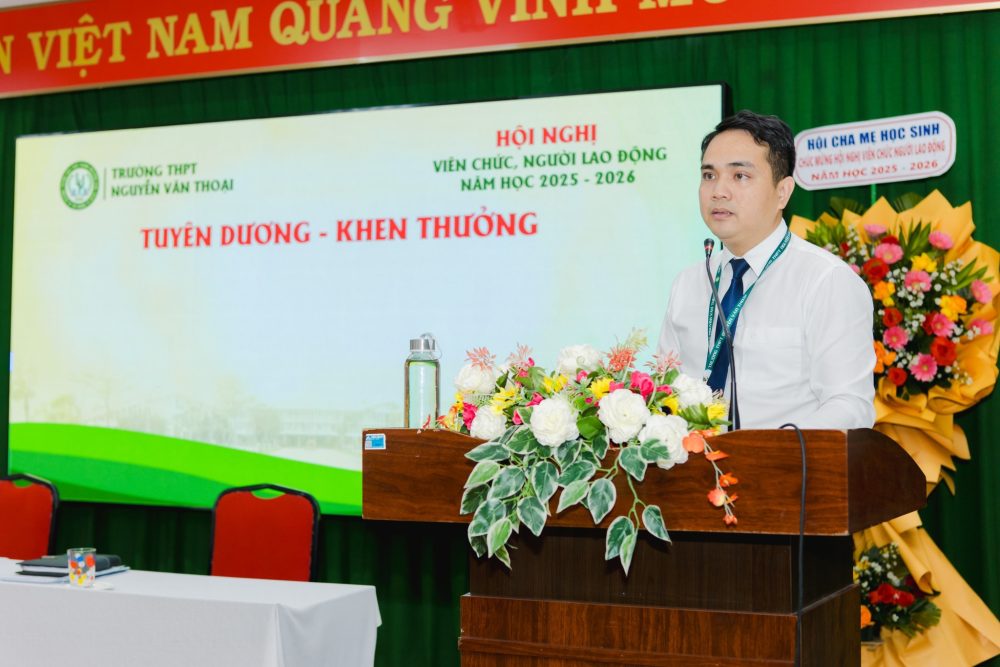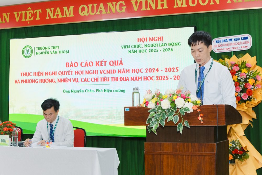 Chiều 18/10, Trường THPT Nguyễn Văn Thoại đã long trọng tổ chức Hội nghị Viên chức, người lao động (VC-NLĐ) năm học 2025-2026. Hội nghị đã thông qua Nghị quyết năm học mới với nhiều mục tiêu và giải pháp đột phá, thể hiện ý chí đoàn kết và quyết tâm cao của toàn thể đội ngũ sư phạm nhà trường.