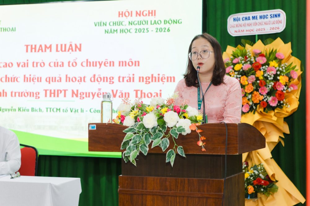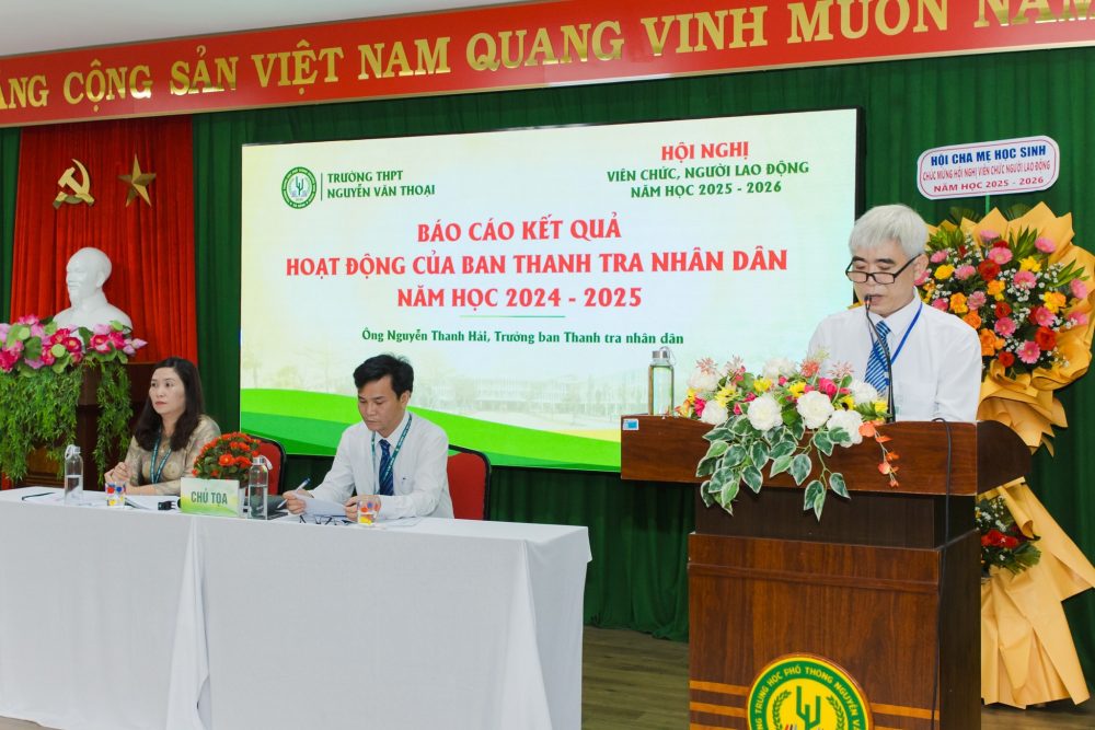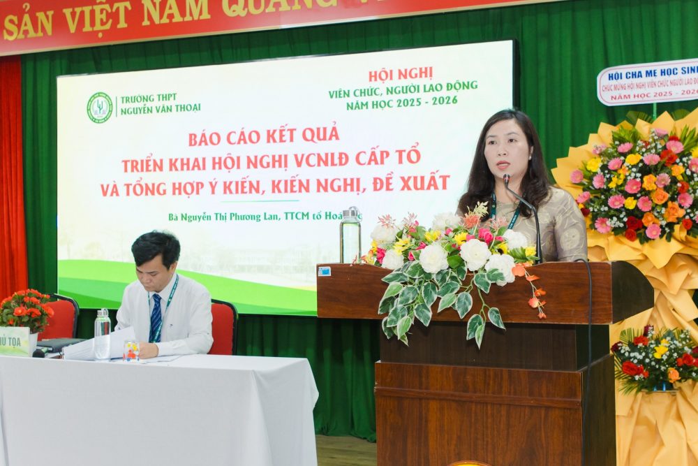 Phát biểu chỉ đạo tại hội nghị, bà Bùi Thị Thu Thủy, Phó Trưởng phòng TCCB Sở GDĐT, đã ghi nhận và biểu dương những thành tích mà nhà trường đạt được trong năm học qua. Bà cũng đề nghị tập thể sư phạm Trường THPT Nguyễn Văn Thoại tiếp tục phát huy tinh thần đoàn kết, sáng tạo, vượt qua khó khăn để hoàn thành xuất sắc các nhiệm vụ, góp phần vào thành công chung của ngành giáo dục thành phố.