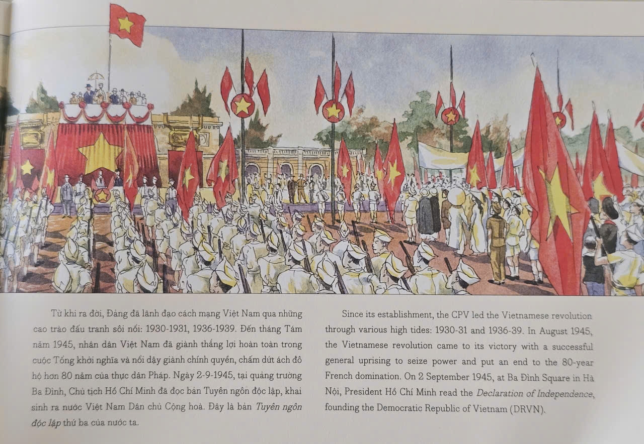 Điều đặc biệt khiến cuốn sách này trở nên nổi bật chính là tinh thần dân tộc, lòng yêu nước được thể hiện qua từng trang vẽ. Hình ảnh Hai Bà Trưng cưỡi voi khởi nghĩa, Ngô Quyền phá tan quân Nam Hán trên sông Bạch Đằng năm 938, hay Bác Hồ đọc bản Tuyên ngôn Độc lập tại Quảng trường Ba Đình năm 1945, tất cả đều khắc họa một cách hào hùng, gợi lên niềm tự hào và xúc động mãnh liệt trong lòng người đọc.